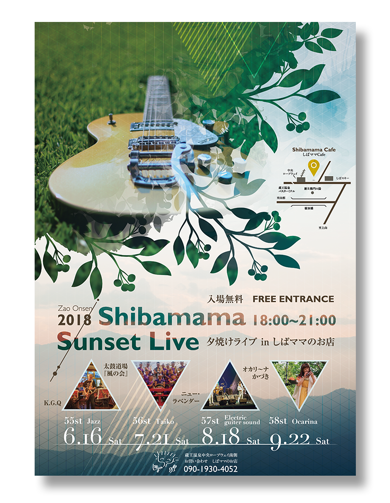 時々行われる「夕焼けライブ」のハガキDM、ポスター、フライヤーをデザインいたしました。