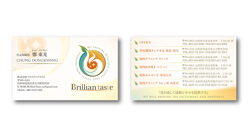 ロゴデザイン、名刺・封筒・お食事券等を統一したイメージで作成しました。
